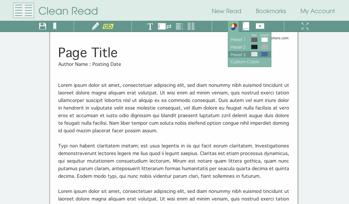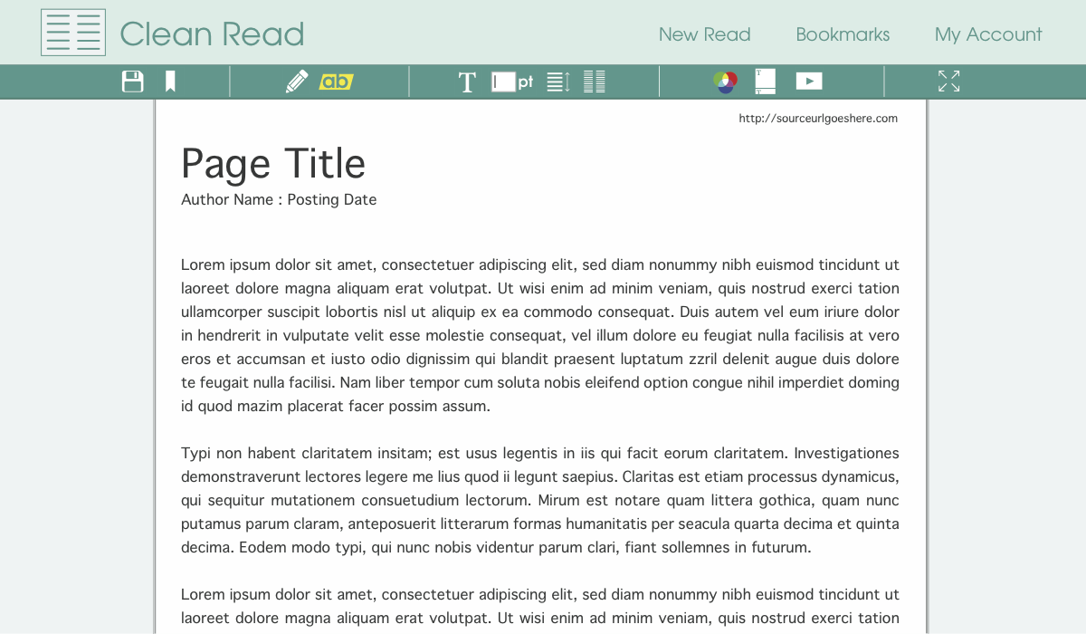 CleanRead makes reading articles and content from the web easy on your eyes, and your brain. Users simply provide a target url and CleanRead will collect the content, strip out unnecessary clutter, and provide a clean, distraction-free reading environment. Users will also have the option to customize their reading experience for both health and aesthetic preferences, including: changing theme colors (to fit with lighting and eye strength), font variations and line height, horizontal or vertical scrolling, continuous or page-based reading, and ability to disable images/video/links. Users can also create an optional account in order to bookmark their readings, annotate, and have the ability to export and save documents to a variety of formats.