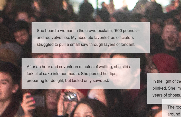 Each piece of flash fiction serves as its own story, but when presented together, the narratives can be reshuffled and individually moved around the screen. The dragging feature allows the reader curatorial judgment over the content and the ability to restructure the narrative as they see fit, trying out endless arrangements.