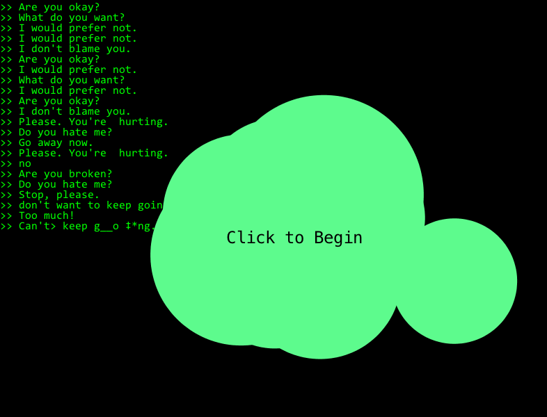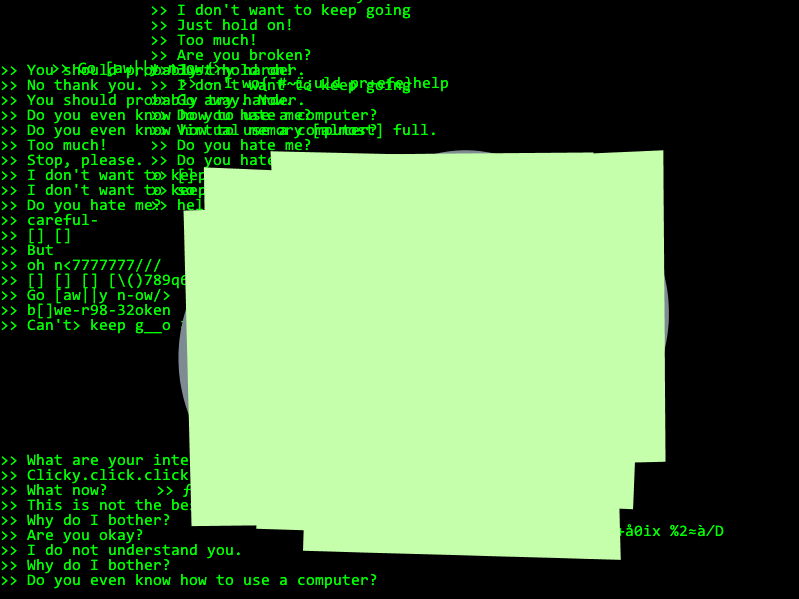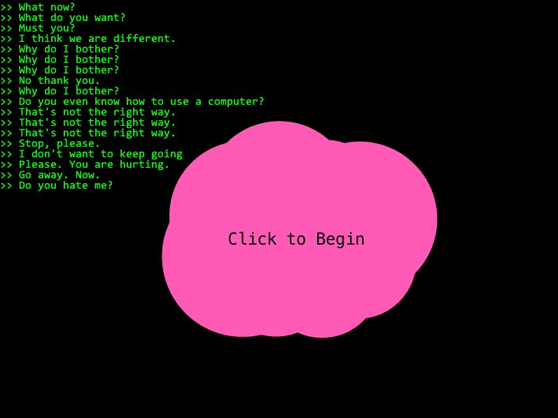 Users interact by clicking, pressing, or dragging on a pulsating, blob-like shape. Interaction provokes particular "emotional" responses from the blob, which functions as a stand in for the computer on which it is being used - the computer that "hates you." The repetitive interactions mimic futile attempts to problem solve on computers by retrying the same action, hoping for a different result. Tension over the gamic nature results from a lack of objective, or even ability to ever complete the interactions asked of the user.
