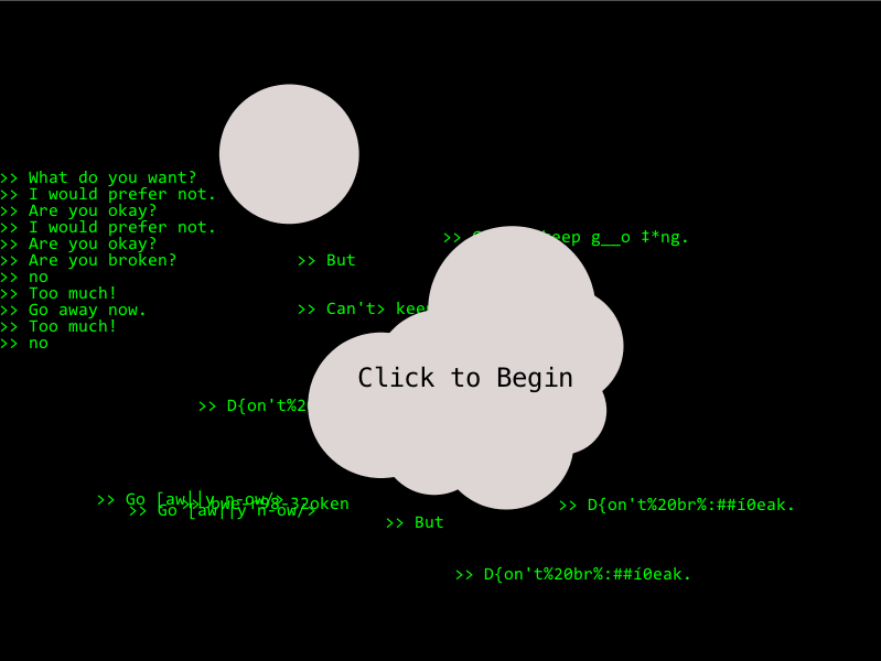 “My Computer Hates Me” was built using Processing and Processing.js along with the RiTa library. More detailed analysis and documentation of “My Computer Hates Me” can be found on HASTAC as part of the Brown University class blog "Click Here to Continue," taught Spring 2014 by Fiona Barnett.