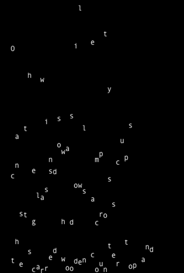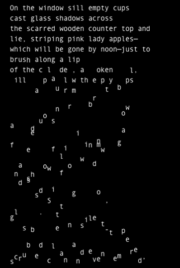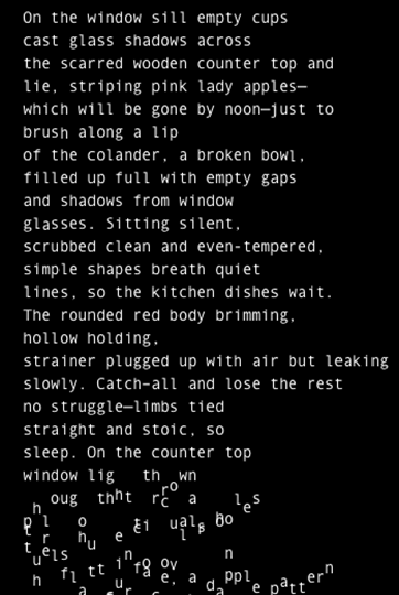 The digitally-adapted version of Pull adds the element of time and space into its reading. The pensive nature of the descriptive poem lends itself to a slow reading, forced here through a delay in the appearance of each line. Additionally, the animation of the letters, appearing first at the bottom of the page and working their way up, jittering like little creatures, until they reach their appropriate position in the poem, reveals a physical quality which mirrors how essential the individual characters are to the constrained structuring and vocabulary of the poem.